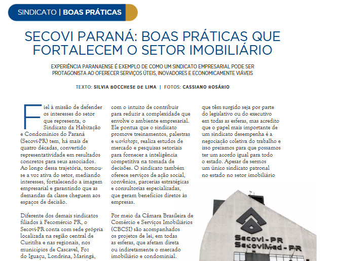 Na edição 167 (julho/agosto de 2025) da revista da Fecomércio, o Secovi-PR ganha destaque por suas práticas inovadoras e pelo papel estratégico na consolidação do setor imobiliário e condominial no Paraná.